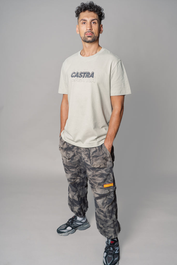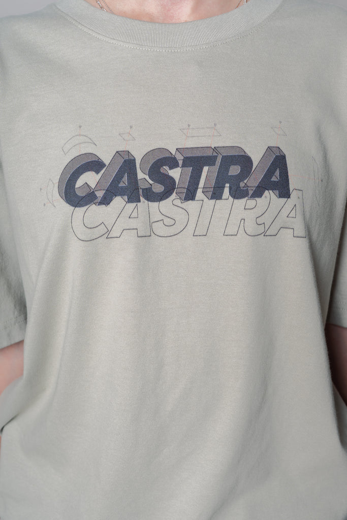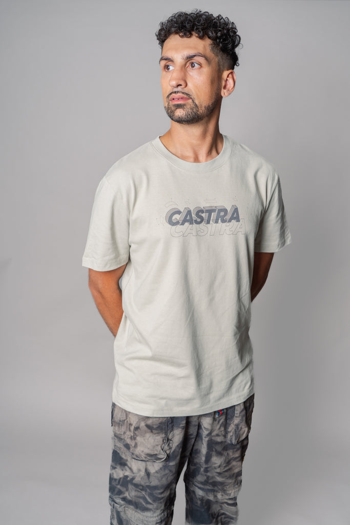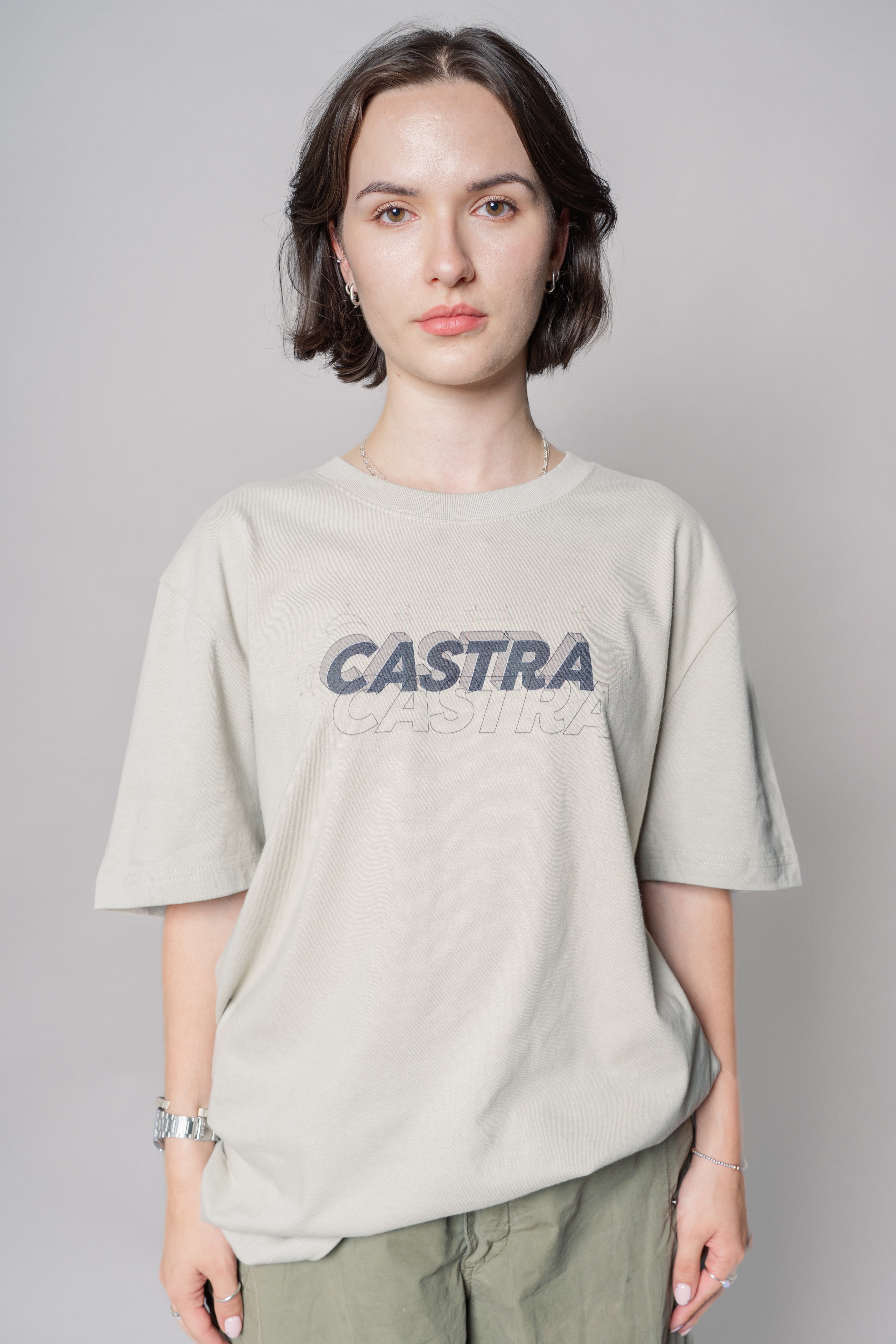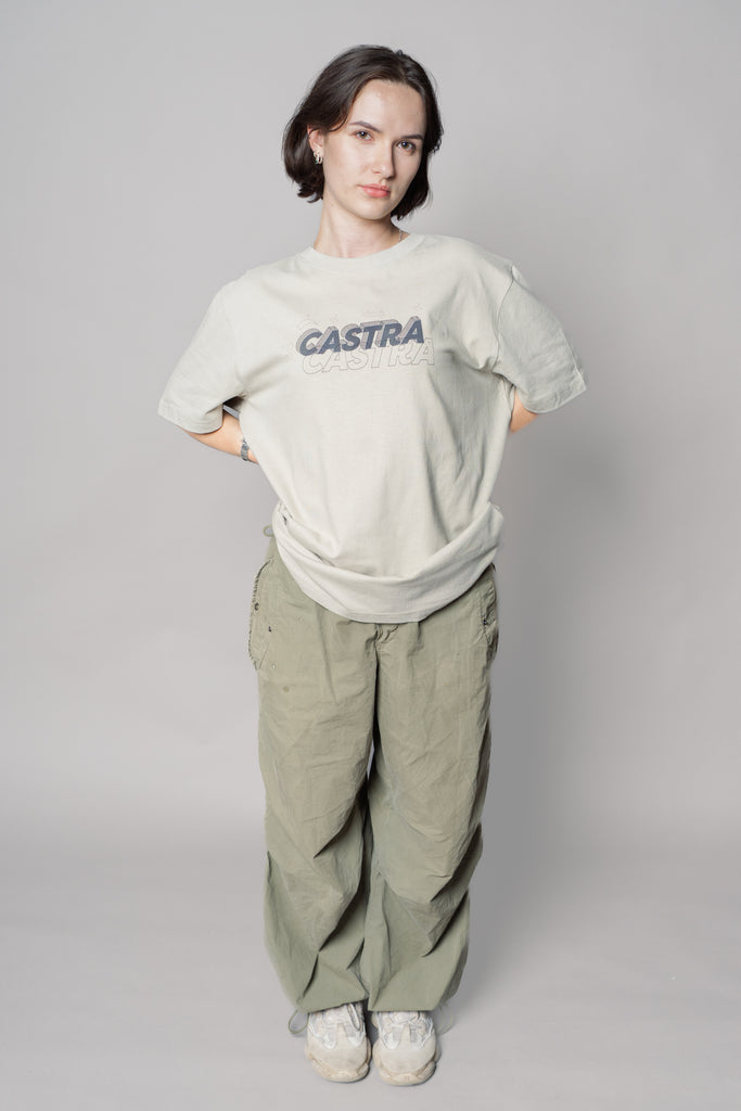 CASTRA ‘Wordmark Blueprint’ stone tee, manufactured from 100% organic, 215GSM cotton with an relaxed, slightly oversized fit. CASTRA design screen printed onto the front. Sizing guide is last image.